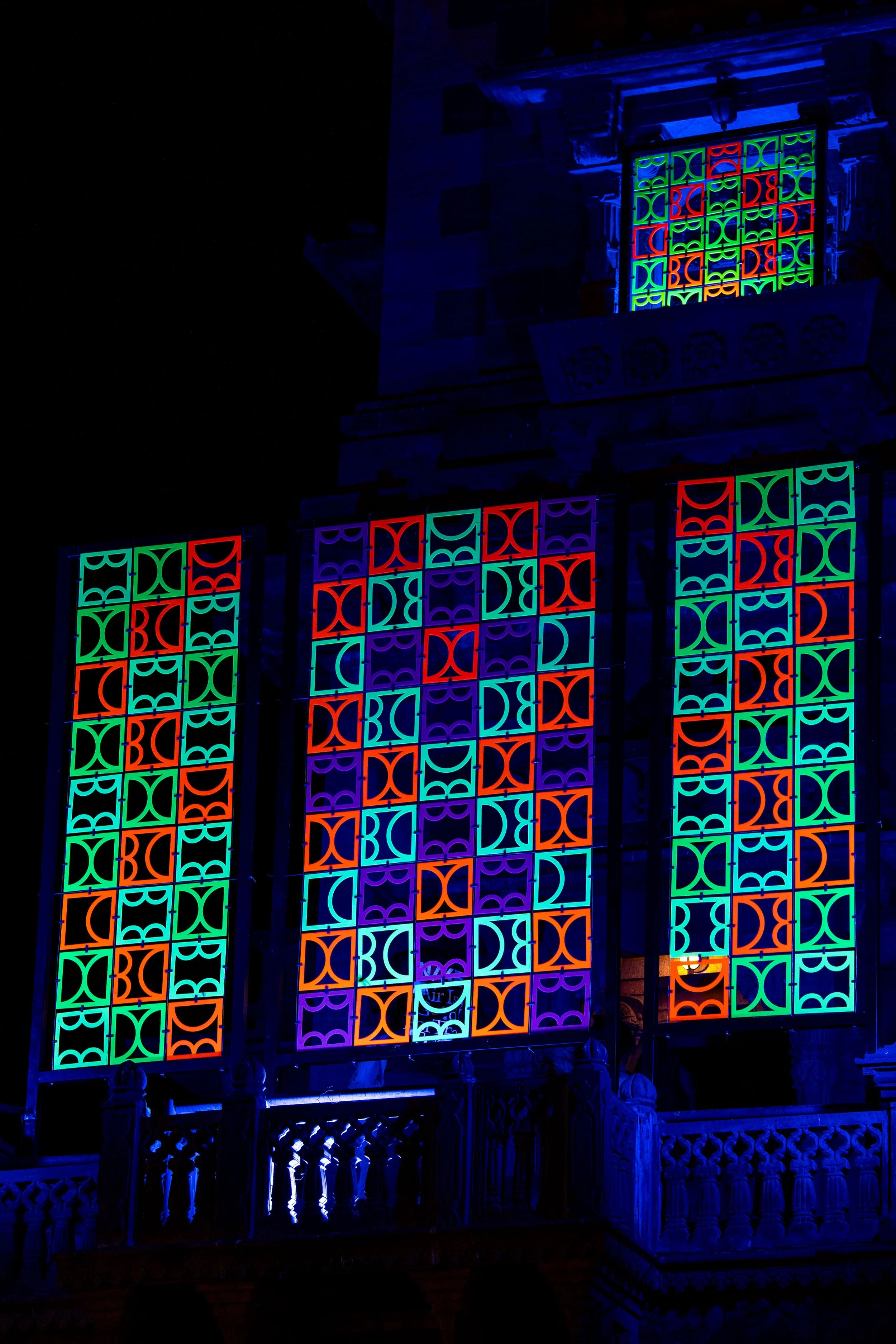 Historically, jaalis served both aesthetic and climatic purposes, casting intricate shadows while regulating light and airflow. This is an interplay Shemza reimagines through light, colour and visual rhythm. Using fluorescent Perspex activated by ultraviolet light, she recreates the ephemeral, patterned luminosity of the jaali, evoking the quiet geometry and atmospheric richness of traditional architecture.